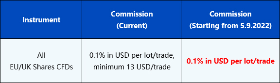 Please be advised that the minimum commission 13 USD per trade of all EU/UK Share CFDs product will be removed starting from 5th September 2022 to further optimise the competitiveness and improve the trading environment.