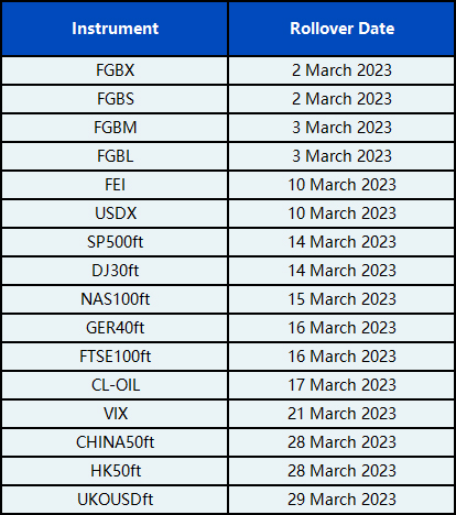 Please be advised that the following CFD instruments will be automatically rolled over as per the dates in the table below. As there can be a pricing difference between old and new futures contracts, we recommend clients to monitor their positions closely and manage positions accordingly.